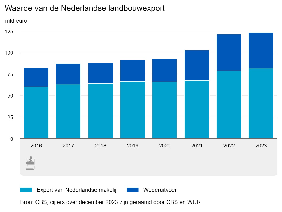 De Nederlandse economie heeft in 2023 naar schatting 50,4 miljard euro verdiend aan de export van landbouwgoederen (4 procent hoger dan in 2022), waarvan 45,7 miljard euro dankzij de export van Nederlandse makelij en 4,7 miljard euro dankzij de wederuitvoer van landbouwgoederen die in het buitenland geproduceerd zijn.