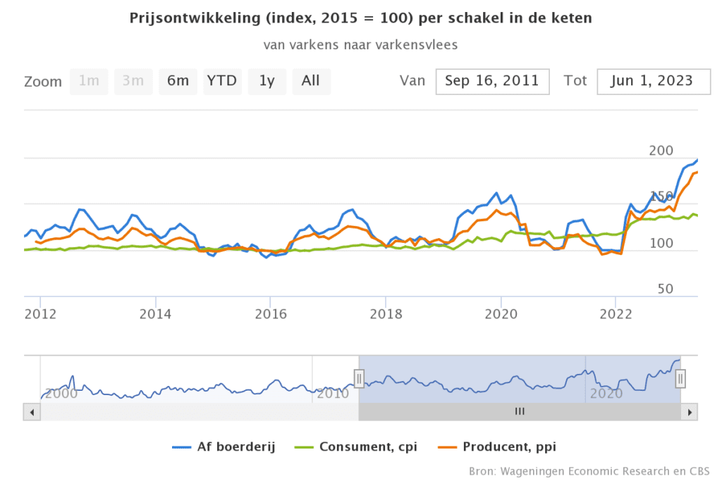 De af-boerderijprijs vertoonde, logischerwijs, dan ook een stijgende lijn, tot 192 punten in mei. Dat is bijna twee keer zo hoog als in januari 2022 (98 punten). Het totale aanbod aan varkensvlees in de EU is in 2022 met 1,3% gedaald ten opzichte van het jaar ervoor; echter, de verwachting voor 2023 is een daling van 5,2% ten opzichte van 2022. Deze forse daling heeft geleid tot een prijsstijging, omdat de vraag naar varkensvlees niet evenredig afgenomen is.