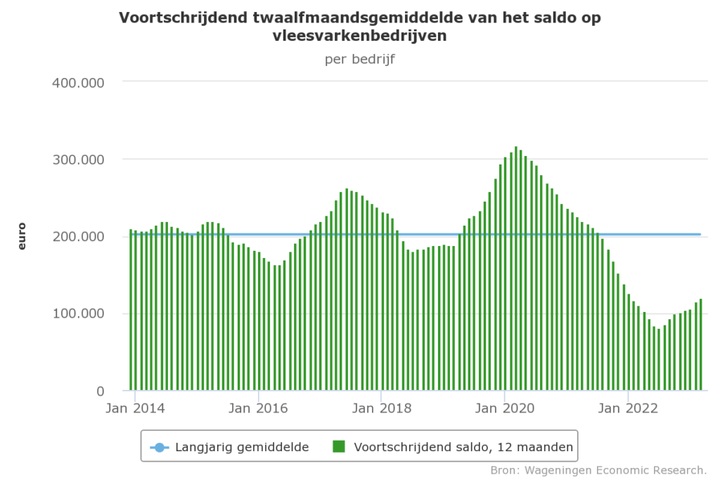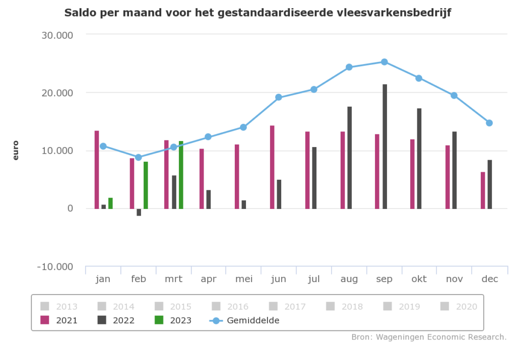 Het voortschrijdend jaarsaldo van vleesvarkens lag in maart 81.000 euro onder het langjarig gemiddelde. Het dieptepunt werd bereikt in juli 2022, waarna een herstel volgde. Daardoor lag in maart 2023 het voortschrijdend jaarsaldo per vleesvarken per jaar 30 euro onder het langjarig gemiddelde saldo van 75 euro.