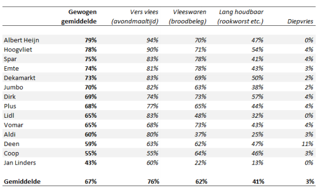 Het gewogen gemiddelde is het gemiddelde van de vier productgroepen, gecorrigeerd op het percentage van de omzet. Zo zorgt vers varkensvlees (karbonades, spare ribs, varkenshaas) voor circa 60% van de omzet, vleeswaren voor 30% en de droge varkensvleesproducten en diepvries elk voor 5%. Bij Albert Heijn en Hoogvliet is het marktaandeel varkensvlees met keurmerk het grootst, bij Jan Linders en Coop het kleinst. Bij Spar, Plus, Emté en Deen is het het aandeel Beter Leven-vlees in het afgelopen jaar aanzienlijk gegroeid.