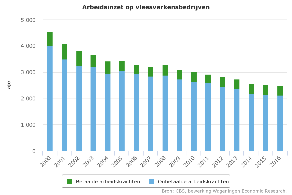 De inzet vanuit het gezin daalde in 2017 met 2,3% tot 84.600 aje, en van buiten het gezin bleef die met 66.200 aje vrijwel gelijk. Dit is een voortzetting van de langjarige trend, waarbij het aandeel van de gezinsarbeid daalt (tussen 2000 en 2017 van 66% naar 56%, zie tabel), en die van arbeid van buiten het gezin toeneemt. Dat geldt overigens alleen voor het volume van de niet-regelmatige arbeid, waarvan het aandeel op het totaal arbeidsvolume is toegenomen van 7% in 2000 tot 20% in 2017. Het aandeel van het arbeidsvolume van personeel met een vast contract is al die tijd vrij stabiel gebleven rond een kwart.