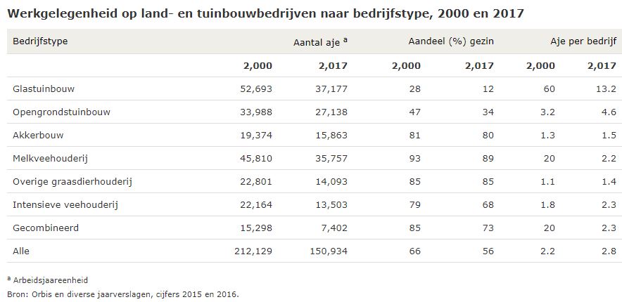 personeel (88% in 2017). De vermindering van het aantal bedrijven in combinatie met een sterke schaalvergroting in de tuinbouw – vooral de glastuinbouw – heeft gezorgd voor een verschuiving van gezinsarbeid naar personeel van buiten het gezin. Van het personeel (buiten het gezin) werkt nu bijna 80% op tuinbouwbedrijven. De bedrijven in de meer grondgebonden sectoren steunen nog altijd voor het overgrote deel op de inzet van het gezin.