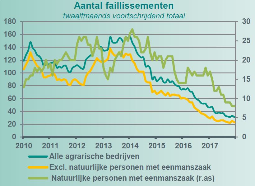 In 2017 daalde het aantal faillissementen in de agrarische sector met 34%. In 2017 gingen er (slechts) 31 bedrijven failliet. Dit aantal ligt historisch laag.