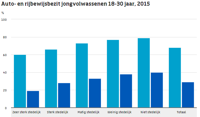 Het autobezit van jongeren die op het platteland wonen is twee keer zo hoog als van stadsjongeren. Begin 2015 had gemiddeld 1 op de 5 jongeren (18 tot 30 jaar) in de zeer stedelijke gebieden een auto. In niet stedelijke gebieden was dat 2 op de 5. Dit blijkt uit recent onderzoek van het CBS naar het autobezit van jongeren.