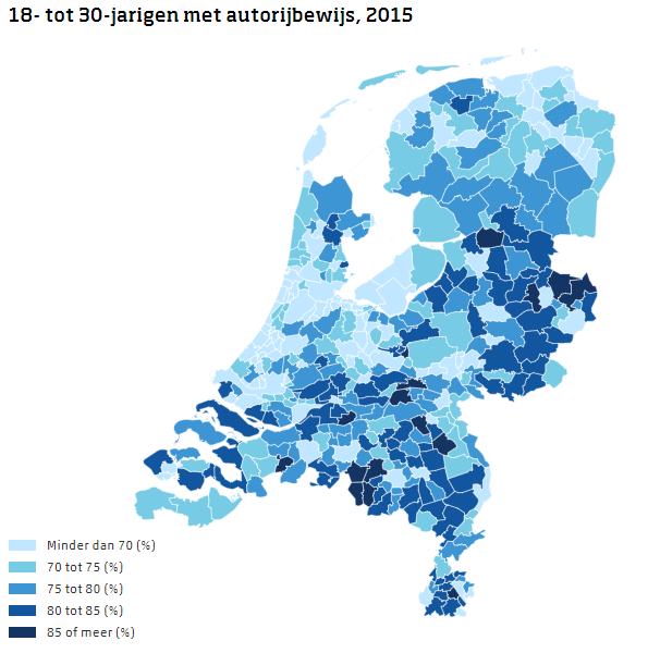 Het verschil in auto- en rijbewijsbezit tussen jongeren in zeer sterk stedelijke gebieden en niet stedelijke gebieden is groot. Bijna 80 procent van de jongeren in de niet verstedelijkte gebieden had in 2015 een rijbewijs. In Tubbergen, Reusel-De Mierden, Oirschot, Aalburg en Staphorst is het rijbewijsbezit onder jongvolwassenen het hoogst. Meer dan 85 procent van de jongeren in deze gemeenten had in 2015 een rijbewijs.