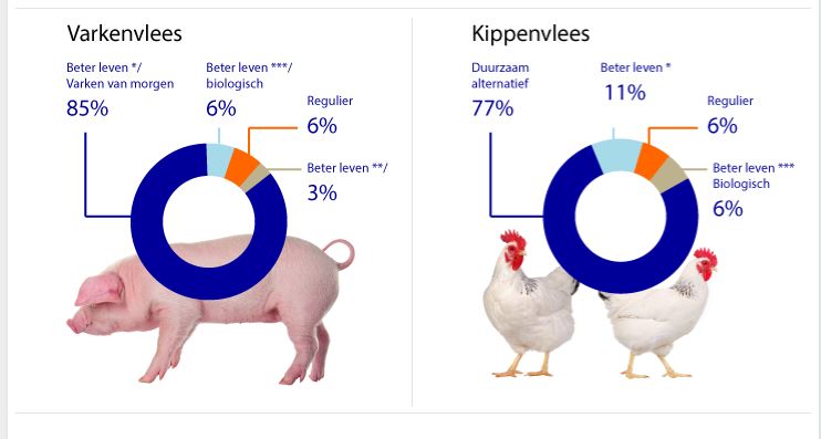 De afbeelding hierboven geeft de procentuele verdeling van vlees in het versschap weer in de supermarkten, op basis van CBL data.