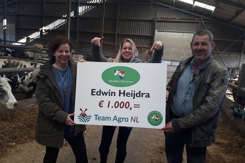 Heijdra Vleesvee uit IJsselstein heeft de eerste 1.000 euro gestort op de bankrekening van Team Agro NL. Penningmeester Henny Verhoeven en boerin Femke Wiersma kregen gistermiddag uit handen van Edwin Heijdra van Heijdra Vleesvee een symbolische cheque ter waarde van 1.000 euro.