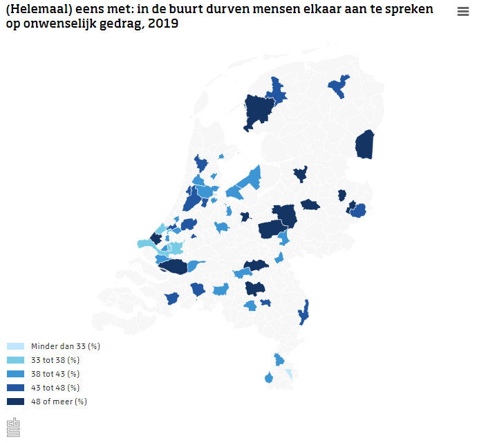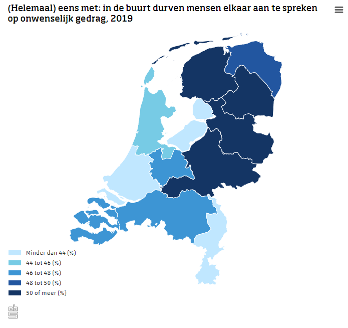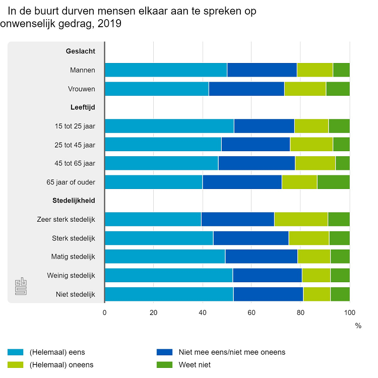 46 procent vond in 2019 dat de mensen in de buurt elkaar durven aan te spreken op onwenselijk gedrag; 16 procent vond dit niet. Mannen waren het met deze stelling vaker eens dan vrouwen (50 tegen 43 procent), jongeren vaker dan ouderen (53 tegen 40 procent).