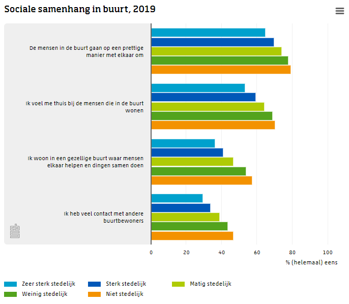 Het aandeel dat zei dat mensen in de buurt op een prettige manier met elkaar omgaan varieert van 79 procent in niet-stedelijke gebieden tot 65 procent in zeer sterk stedelijke gebieden. Ruim de helft van de bewoners van niet-stedelijke gebieden zei dat ze in een gezellige buurt wonen waar mensen elkaar helpen en dingen samen doen, tegen ruim 1 op de 3 in zeer sterk stedelijke gebieden. Het minst waren Nederlanders het eens met de stelling dat ze veel contact hebben met andere buurtbewoners. Ook hier oordeelden bewoners van het platteland vaker positief dan stedelingen (47 procent tegen 29 procent).