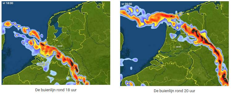 Tussen 15 en 16 uur bereiken de eerste buien Zeeland waarna de buienlijn rap noordwaarts trekt. Rond 18 uur houden we de lijn Zuid-Holland-Utrecht-Noord-Limburg aan, en rond 20 of 21 uur ligt de lijn met buien bij de Waddeneilanden.