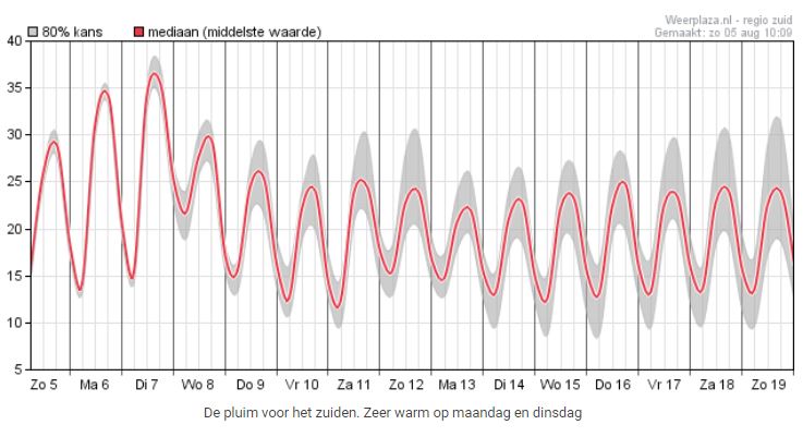 Zoals u onwaarschijnlijk weet werden afgelopen vrijdag en zaterdag in delen van Portugal en Spanje temperaturen van ruim 45 graden gemeten. De warme lucht die dit veroorzaakte is bezig met een opmars richting het noordoosten. Naar verwachting zal deze lucht dinsdag 7 augustus Nederland bereieken. Tijdens de trek deze kant op verliest de lucht wel warmte, maar ondanks dat zal de luchtstroom alsnog voor verzinderende temperaturen gaan zorgen in Nederland.