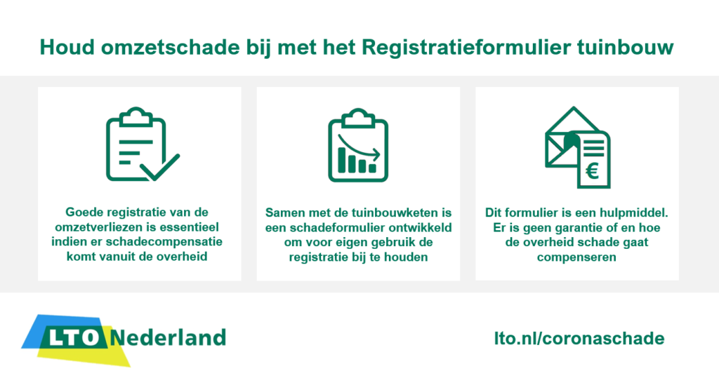 Boeren en tuinders leiden veel omzetschade door het uitvallen van vraag en doordat extra kosten moeten worden gemaakt. Het is belangrijk dat ondernemers hun omzetschade en extra kosten goed bijhouden en vastleggen. Registratie van uw schade betekent niet dat ondernemers hiermee aanspraak maken op compensatie. De registratie is vooral bedoeld om, indien er een regeling voor schadecompensatie komt, een claim onderbouwd kan worden.