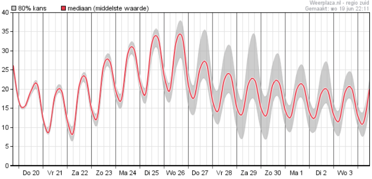 Of er daadwerkelijk ook warmterecords gaan sneuvelen is nog even afwachten. Daarvoor is het nog te vroeg en zien we in de pluimen nog teveel spreiding. Dinsdag en woensdag worden in ieder geval dagen om in de gaten te houden want dan kan de temperatuur in het binnenland oplopen tot misschien wel ruim 36 graden. De dagrecords voor 25 en 26 juni staan op respectievelijk 34,0 en 34,1 graden. In 1976 werden deze records gevestigd in Volkel.