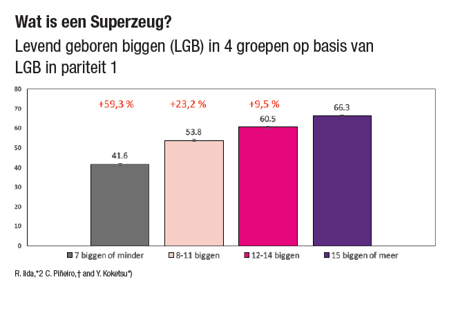 Gelten die 15 of méér levend geboren biggen werpen, worden de superzeugen van het bedrijf. Zij zullen namelijk hun hele leven méér biggen werpen dan zeugen met een kleinere worp. Uit een eerste analyse van ‘big data’ door Carlos Piñeiro, directeur van PigChamp in Spanje, blijkt dat de eerste worp een beter criterium is dan het aantal gespeende biggen.