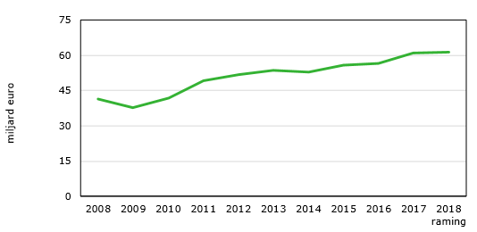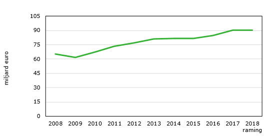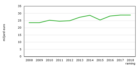 Sinds het crisisjaar 2008 is slechts twee keer (in 2009 en 2015) sprake geweest van een absolute exportdaling (figuur 2.1). De geraamde landbouwexport voor 2018 ligt 38% hoger dan de waarde in 2008. Dat komt door zowel een hoeveelheids- als een prijseffect (zie paragraaf 4.2).