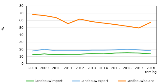 Het landbouwhandelsoverschot laat een opvallende ontwikkeling zien als we deze vergelijken met het totale geraamde goederenhandelsoverschot van Nederland. Na een vrijwel continue afname van het landbouwaandeel van 68% in 2008 naar 49% in 2017, schiet het aandeel in 2018 weer omhoog naar 58%. De reden is dat het totale goederenhandelsoverschot dit jaar fors lager zal uitkomen dan in 2017. Deze daling komt voor het overgrote deel door een sterk groeiend tekort in de handel in minerale brandstoffen. Daarbij speelt een toenemende import van aardgas en ruwe aardolie een grote rol (zie ook CBS, 2018a).