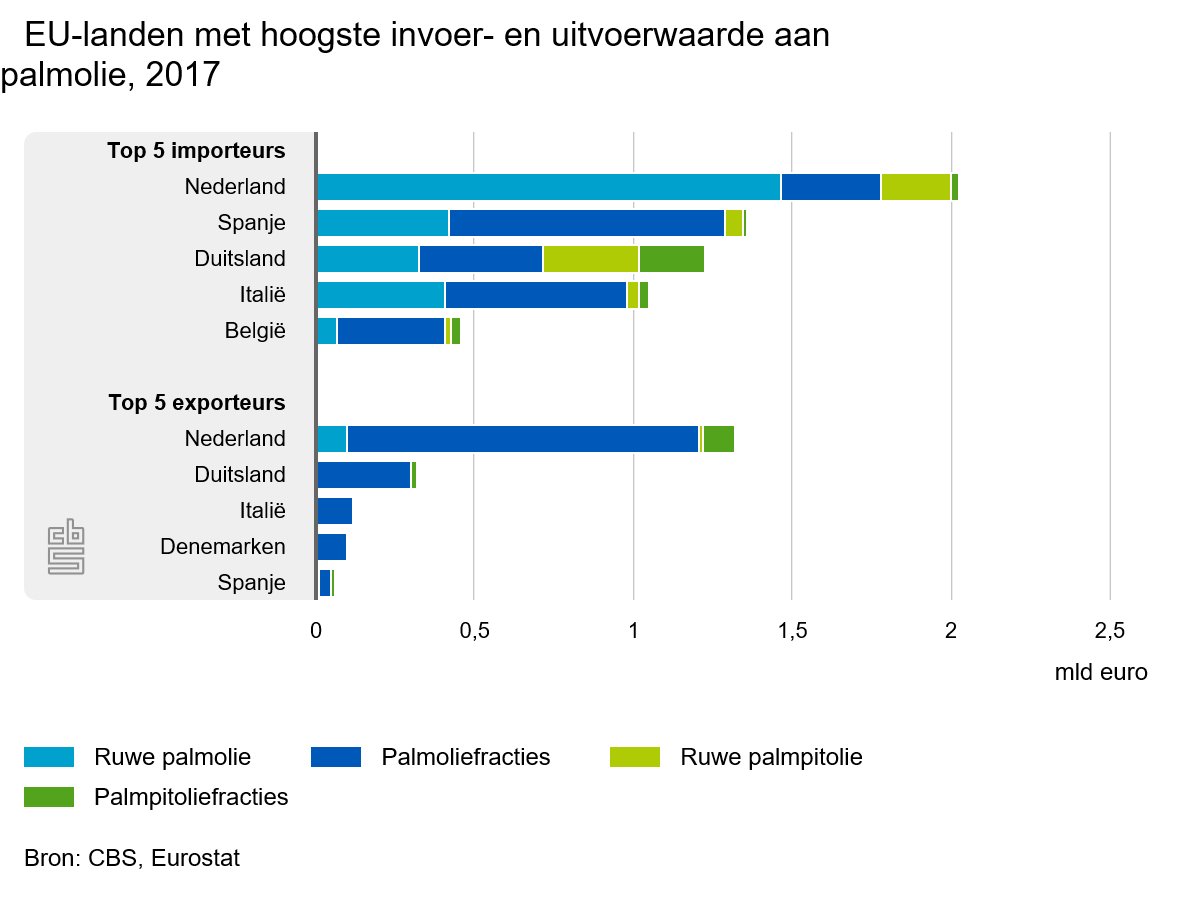 Binnen de Europese Unie is Nederland veruit de grootste importeur van palmolie. Na Nederland (ruim 2 miljard euro) volgens Spanje, Duitsland, Italië en België. Ruwe palmolie betreft met 72 procent het grootste gedeelte van de in Nederland ingevoerde palmolie. Vergeleken met andere landen is dit aandeel aanzienlijk hoger. Het overige deel van de ingevoerde palmolie betreft met 15 procent palmoliefracties, met 11 procent ruwe palmpitolie en met 2 procent palmpitoliefracties. Met 1,3 miljard euro is Nederland van Europa ook de grootste palmolie-exporteur, op afstand gevolgd door Duitsland. De Nederlandse export bestaat voor het overgrote deel (84 procent) uit palmoliefracties. Deze worden gewonnen uit de ingevoerde ruwe palmolie. De bewerking hiervan vindt in Nederland plaats. Palmpitolie en ruwe palmolie worden echter nauwelijks door Nederland uitgevoerd.