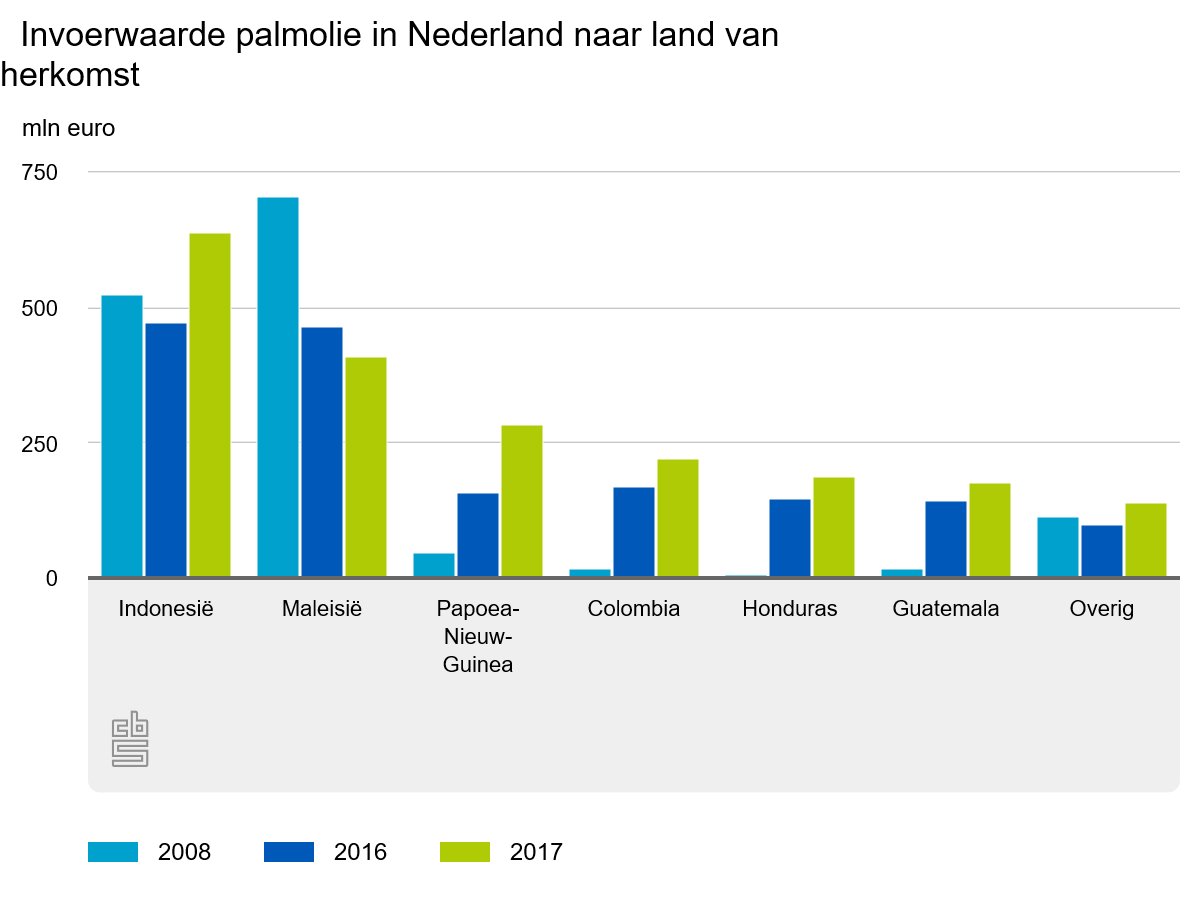 De palmolie die door Nederland wordt geïmporteerd is voornamelijk afkomstig uit de volgende zes landen: 31 procent komt uit Indonesië, 20 procent uit Maleisië, 14 procent uit Papoea-Nieuw-Guinea, 10 procent uit Colombia en 9 procent uit Honduras en Guatemala. Vergeleken met 2016 nam de invoer uit al deze landen toe. De landenverdeling is sterk gewijzigd in vergelijking met 2008. Terwijl in 2008 nog 86 procent van de palmolie uit Indonesië of Maleisië kwam, was dit in 2017 nog maar iets meer dan de helft (51 procent). In deze periode nam het aandeel van de invoer uit Latijns-Amerika van 3 naar 29 procent toe.