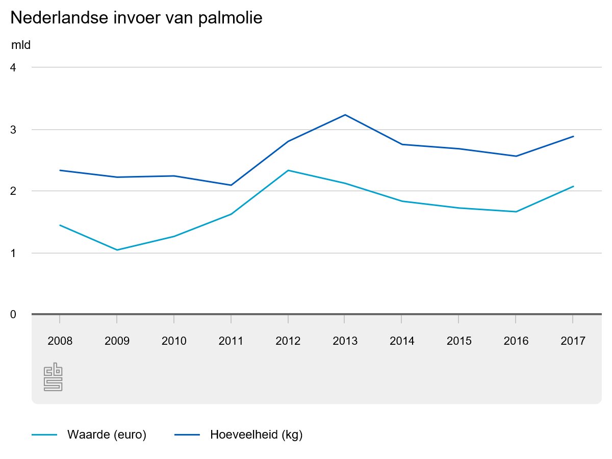 De toename van de invoerwaarde van palmolie is in gelijke mate toe te schrijven aan de prijsstijgingen en volumegroei. In 2017 werd er voor 2,8 miljard kilogram aan ruwe palmolie, palmoliefracties en palmpitolie geïmporteerd. In 2013 was de ingevoerde hoeveelheid het hoogste met 3,2 miljard kilo. Met 2,3 miljard euro kende 2012 de hoogste invoerwaarde aan palmolie.