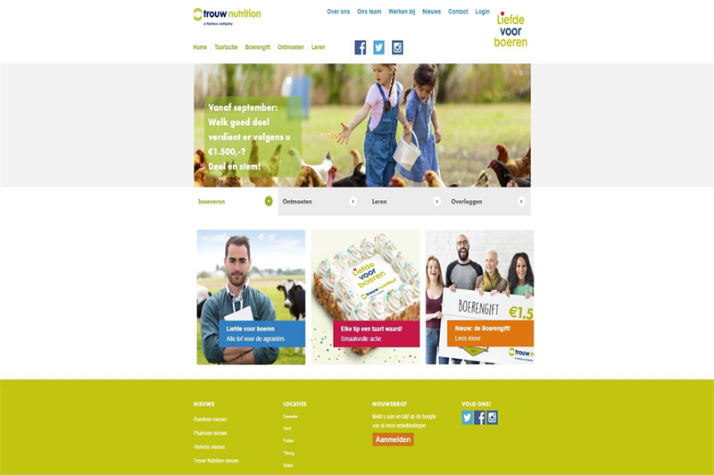 Trouw Nutrition lanceerde maandag 16 juli een nieuw digitaal boerenplatform. Op www.liefdevoorboeren.nl kunnen boeren elkaar inspireren, ontmoeten en onderling tips uitwisselen. Bovendien biedt het platform actuele kennisartikelen, die betrekking hebben op de rundvee-, pluimvee- en varkenssector.