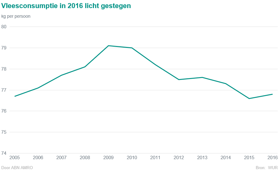 Sinds 2010 is de vleesconsumptie in Nederland aan het dalen. In zes jaar tijd is de consumptie per persoon in totaal met 3% afgenomen, maar in 2016 steeg de vleesconsumptie weer. Het gaat economisch beter. Hierdoor hebben consumenten meer te besteden en gaan ze vaker uit eten. Dat zorgde voor deze stijging van de vleesconsumptie.