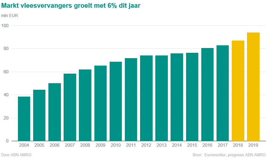 De markt voor vleesvervangers in Nederland zal naar de verwachting van ABN AMRO in 2018 met 6% en 2019 met 8% gaan groeien. Er zijn steeds meer consumenten die opzoek zijn naar een alternatief voor vlees. Dit vanwege gezondheids-, klimaat-, of dierenwelzijnsredenen. Maar daarnaast neemt ook het aanbod van vleesvervangers toe en kunnen deze nieuwe vervangers van vlees op smaak en structuur steeds beter concurreren met vlees.