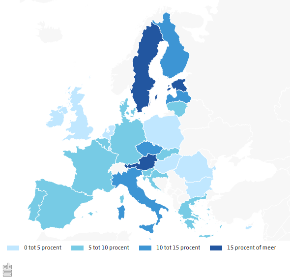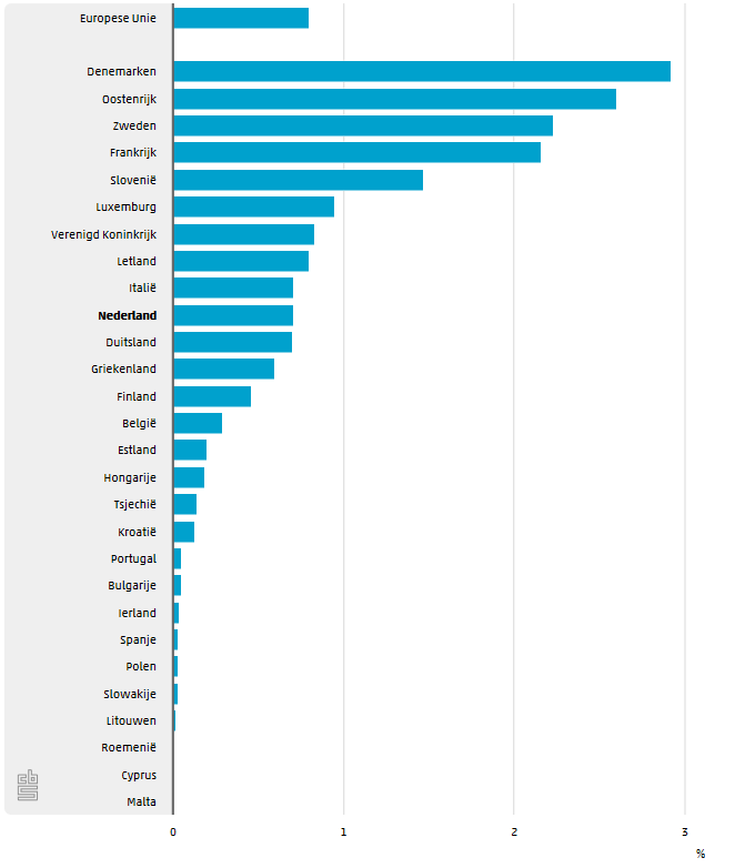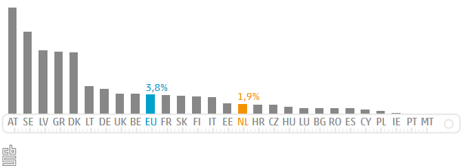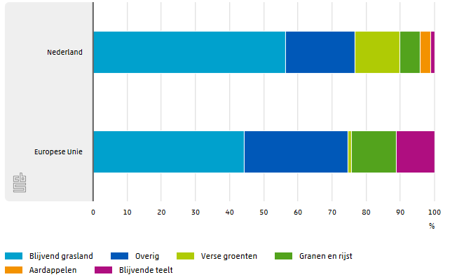 In Nederland liggen de aandelen groenten (13,0 procent) en aardappelen (2,9 procent) aanzienlijk boven het EU-gemiddelde van respectievelijk 1,1 procent en 0,2 procent. De aandelen granen (6,1 procent) en blijvende teelt (1,1 procent) liggen onder het EU-gemiddelde.