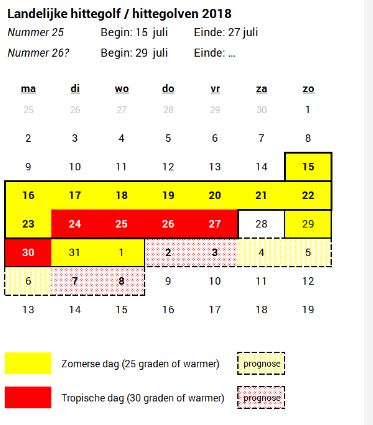 Wanneer het Nederland lukt om dit jaar een tweede landelijke hittegolf te kunnen registreren, is er wel een merkwaardig verschil met de jaren 1941 en 2006. In beide gevallen zat er tussen de beide landelijke hittegolven minimaal één week met minder weer. Dit jaar zou het slechts 1 dag betreffen dat de temperatuur onder de 25 graden blijft steken. Op 28 juli werd er in De Bilt een maximale temperatuur van 24,2 graden gemeten. Hierdoor kan de zomer van 2018 niet de boeken in als de zomer met de langste landelijke hittegolf ooit.
