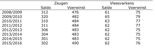 De technische kengetallen zijn aangepast op basis van de Kengetallenspiegel van Agrovision. De voerwinst en saldo voor de lange termijn zijn vastgesteld op respectievelijk € 490 en € 302 per gemiddeld aanwezige zeug per jaar en respectievelijk € 76 en € 62 per gemiddeld aanwezig vleesvarken per jaar (exclusief omzetbelasting). In onderstaande tabel staan de saldobegrotingen weergegeven.