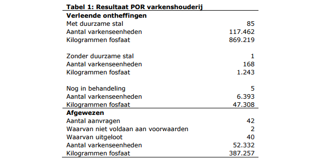 Bij de varkenshouderij zijn nog 5 en bij de pluimveehouderij nog 10 aanvragen in afwachting van definitieve akkoord op alle aan de ontheffing verbonden voorwaarden. Op het moment dat deze aanvragen definitief zijn worden zowel binnen de varkens- als de pluimveehouderij de respectievelijke plafonds volledig benut.