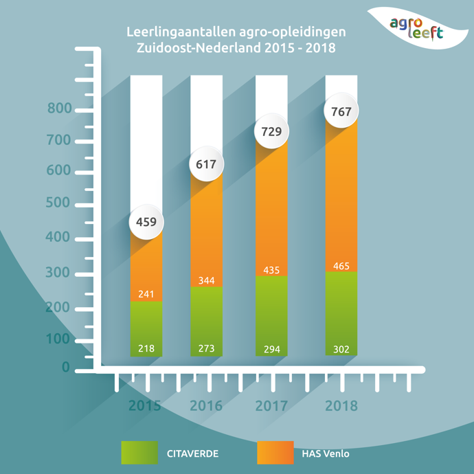Ten opzichte van 2015 steeg het aantal studenten in de agrosector in onze regio met  67%. In 2015 telde de agro-opleidingen van HAS hogeschool in Venlo & CITAVERDE College 459 leerlingen, in 2018 zijn dit er 767. Het aantal BBL-studenten (Beroeps Begeleidende Leerweg) verdubbelde zelfs in deze periode.