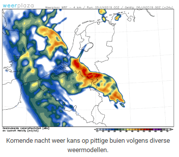 Vanavond laat, maar vooral vannacht, trekken opnieuw stevige buien vanuit het zuiden over ons land. Met name in de zuidelijke helft kunnen de buien gepaard gaan met onweer, veel regen en mogelijk ook weer zware windstoten. Verder naar het noorden nemen de buien in intensiteit af, maar kan er nog wel flink wat water vallen.