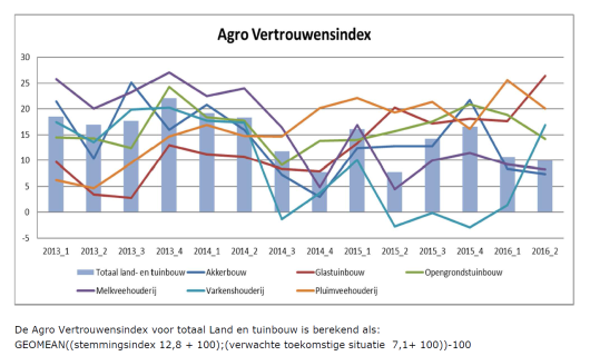 De nieuwste Agro Vertrouwensindex laat per sector meerdere opvallende veranderingen zien, zowel over de huidige situatie alsook de verwachting over 2 à 3 jaar. Meerdere sectoren hebben het afgelopen kwartaal te kampen gehad met uiteenlopende klimatologische omstandigheden. De waarde van de index voor de gehele land- en tuinbouw kwam in het tweede kwartaal uit op 10 (op een schaal van -100 tot 100). Dat komt neer op een daling van nog geen punt ten opzichte van een kwartaal eerder.