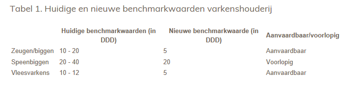 De SDa gaat uit van een ‘aanvaardbaar gebruik’ omdat het houden van dieren altijd gepaard zal gaan met een beperkt gebruik van antibiotica. Zieke dieren moeten behandeld kunnen worden. In tabel 1. staan de huidige en nieuwe benchmarkwaarde(n).