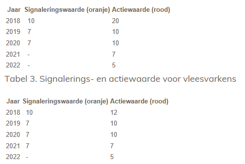 Met de invoering van de nieuwe benchmarkwaarden kunnen bedrijven, die nu ‘in het groen’ zitten, terechtkomen in de categorie ‘oranje’. De POV heeft gepleit voor een overgangstermijn, zodat bedrijven enkele jaren de tijd krijgen toe te werken naar het einddoel (‘categorie groen’). De SDa en het ministerie van LNV hebben dit gehonoreerd. Omdat het stoplichtmodel succesvol is geweest, zal dit model nog enkele jaren worden gehanteerd. De nieuwe signalerings- en actiewaarden vindt u in de tabellen 2 en 3.
