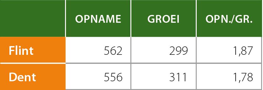 De benutting van zetmeel bij CCM van Dentmais is anders dan bij Flintmais. Door een hoger aandeel prolamine (Zeïne) in de Flint maiskorrel zijn de zetmeeldeeltjes meer aan elkaar verkleefd. In de Dent maiskorrel liggen deze zetmeeldeeltjes losser van elkaar gegroepeerd. De Dent maiskorrel is daardoor zachter, waardoor deze beter in de varkensmaag verteert. Uit de onderstaande proef kunnen we concluderen dat de opname / groei een verbetering te zien gaf van maar liefst 5%.