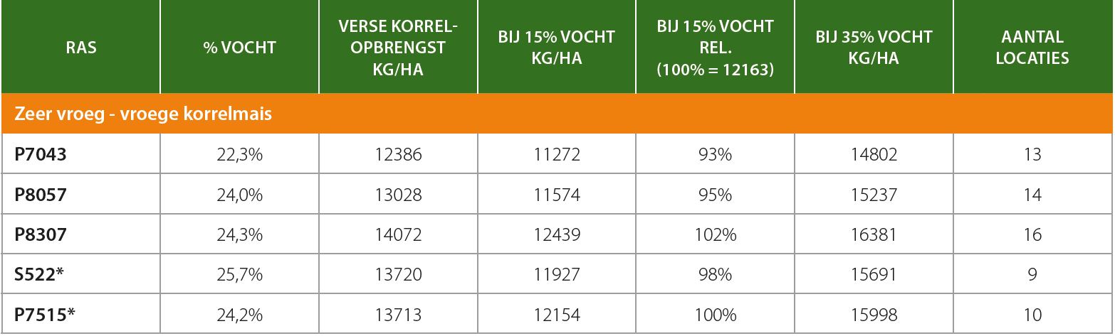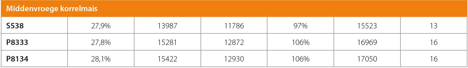 Pioneer beproeft sinds vele jaren haar rassen onder praktijkomstandigheden in de regio. Deze PACTS-proefvelden geven een betrouwbaar beeld van de prestaties van de nieuwe Pioneer genetica. Naast rassen als PR39F58 en P8000, die beiden veel worden ingezet als CCM-mais geeft de onderstaande tabel een goed beeld van de prestaties van onze nieuwe rassen voor de CCM productie.