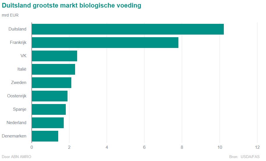 Duitsers geven circa EUR 130 per hoofd van de bevolking uit aan biologische producten. Nederlanders geven in vergelijking tot de Duitsers een stuk minder uit aan biologische voeding. Nederland staat in Europa op de zevende plaats.