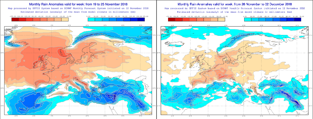 We benadrukken nog maar eens dat deze kaarten afwijkingen laten zien ten opzichte van de normale waarde. Een droger weerbeeld dan normaal wil dus niet zeggen dat het droog weer zal zijn. Er kan wel degelijk neerslag vallen, maar dat zal minder zijn dan de normale hoeveelheid neerslag voor die periode. (Als de verwachting uitkomt).