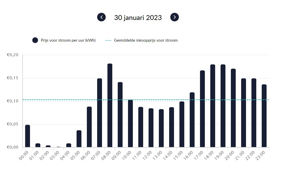 Een voorbeeld: Overdag laad je je EOS vol met zonne-energie die je over hebt. Die energie verbruik je ’s avonds en aan het begin van de nacht. Later diezelfde nacht zijn de stroomprijzen zo laag, of zelfs negatief, dat je heel goedkoop stroom inkoopt (of zelfs geld toe krijgt). Die goedkope stroom verbruik je zelf, of verkoop je terug aan het net op het moment dat de stroomprijzen weer stijgen.