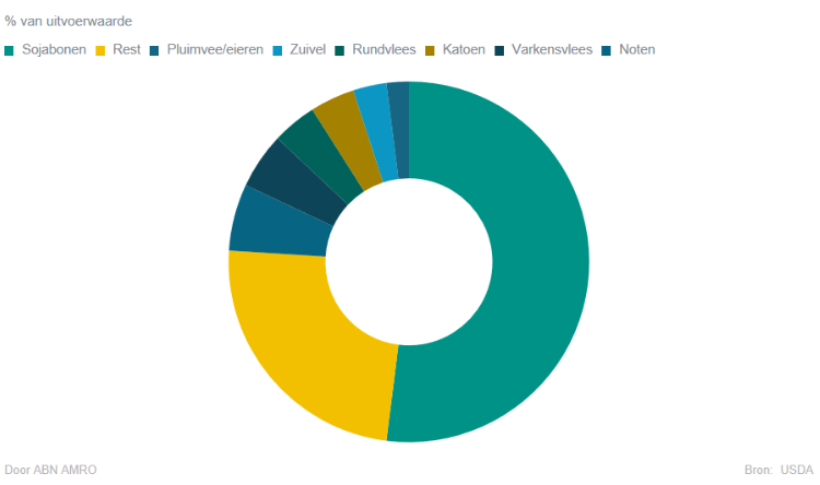 Soja is met 52 procent verreweg het belangrijkste agrarische exportproduct voor de Verenigde Staten. Daarnaast exporteert de Verenigde Staten pluimvee en eieren (2 procent), zuivel (3 procent), rundvlees (4 procent) en varkensvlees (5 procent) naar  China. De uitvoer van deze producten is al flink afgenomen. In een jaar tijd halveerde de uitvoer van Amerikaanse agrarische producten naar China van 22,6 miljard USD (2017) naar 9,2 miljard USD (2018) als gevolg van de handelsoorlog. En dit jaar zal de export van de Verenigde  Staten naar China nog verder dalen.