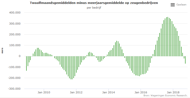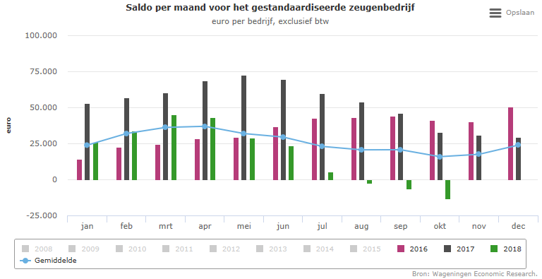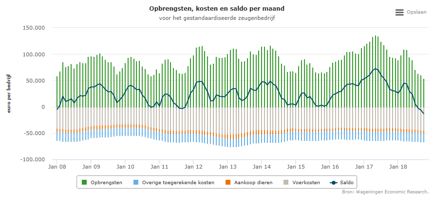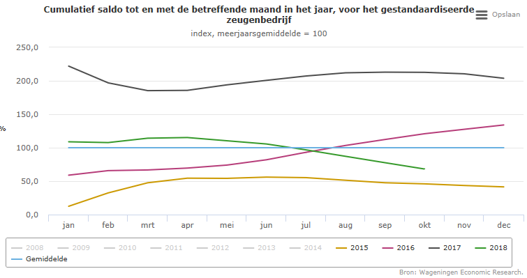 In de eerste tien maanden van 2018 heeft het standaardbedrijf met 800 zeugen bijna 4 ton euro minder saldo behaald dan voorgaand jaar. Dat is veroorzaakt door 31% lagere opbrengsten en 3% hogere toegerekende kosten. Het saldo ligt tot en met oktober 30% onder het langjarig gemiddelde 2008-2017.