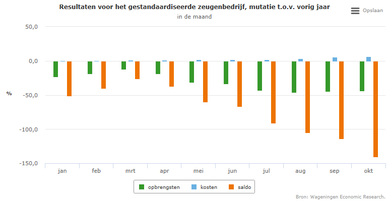 Het saldo van de zeugenhouderij kwam in oktober 46.000 euro lager uit dan in oktober vorig jaar door een bijna halvering van de opbrengsten en 7% hogere kosten. De opbrengsten zijn ontoereikend om de toegerekende kosten goed te maken, waardoor een negatief saldo resteert. De resultaten zijn berekend voor een standaardbedrijf met 800 gemiddeld aanwezige zeugen.
