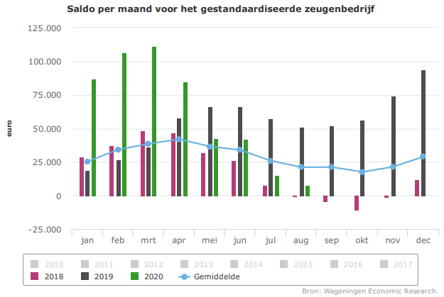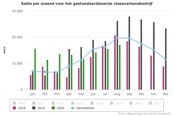 Het maandsaldo van het vleesvarkensbedrijf kwam in augustus uit op 9.100 euro, ofwel 35% lager dan in dezelfde maand vorig jaar. Vanaf medio maart zijn de opbrengstprijzen flink gezakt. Vooral de vleesexport stond lang onder druk door de beperkende coronamaatregelen. Het maandsaldo van de zeugenhouderij daalde in augustus met 85% ten opzichte van dezelfde maand vorig jaar. Dit is het gevolg van sterk gedaalde biggenprijzen. De top van de afgelopen maanden is voorbij, maar het voortschrijdend jaarsaldo ligt nog wel op een hoog niveau.