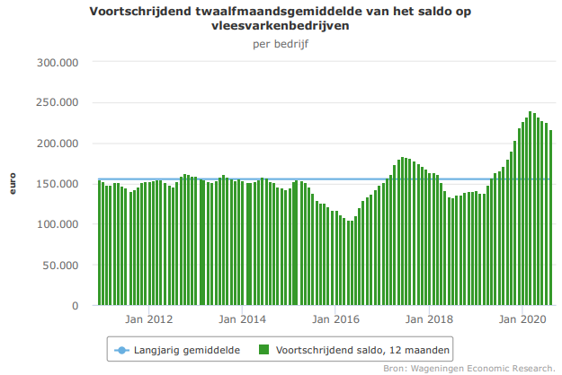 Het voortschrijdend jaarsaldo van vleesvarkens ligt in augustus ruim 60.000 euro boven het langjarig gemiddelde, vooral dankzij de gunstige saldi in het afgelopen jaar. Het recordniveau van maart is achter de rug, maar het jaarsaldo is in de afgelopen maanden het hoogst sinds vele jaren.