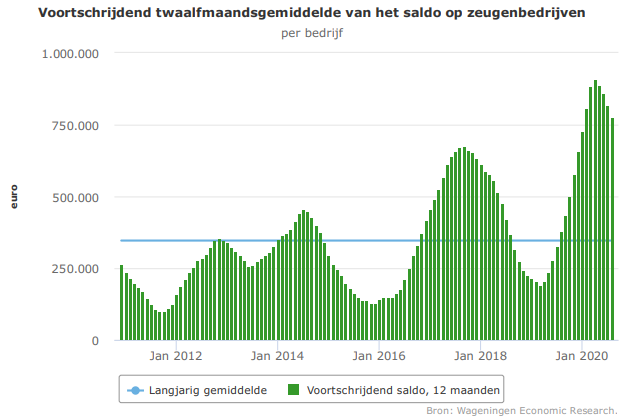 Het voortschrijdend jaarsaldo van zeugen lag in augustus bijna 430.000 euro boven het langjarig gemiddelde, vooral dankzij de gunstige saldi in het voorbije jaar. Daarmee is de top van de afgelopen maanden achter de rug, maar het voortschrijdend saldo ligt historisch gezien nog steeds op een hoog niveau.