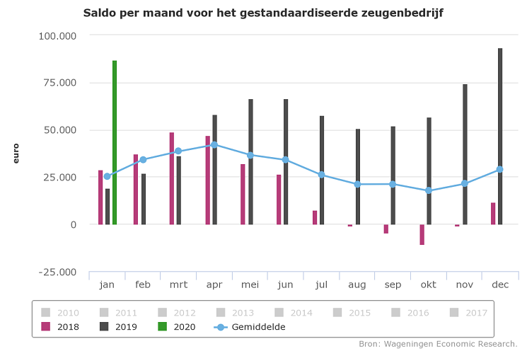 Het saldo van de zeugenhouderij is in januari 2020 ruim vier maal zo hoog als in dezelfde maand vorig jaar. Dit is te danken aan de verdubbeling van de biggenprijzen en de daling van de voerkosten. Het fors gestegen saldo leidt tot een positief inkomen. De resultaten zijn berekend voor een standaardbedrijf met 800 gemiddeld aanwezige zeugen.