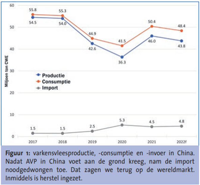 De wereldwijde productie van varkensvlees bedroeg in 2018, voor de grootschalige uitbraak van de AVP in Azië, 119 miljoen ton karkasgewicht. Hiervan werd bijna 9 miljoen ton internationaal verhandeld (als we de EU als één handelsblok zien). De EU was de grootste exporteur met 4,1 miljoen ton per jaar. Sinds de AVP in Oost-Azië om zich heen greep is dit nogal veranderd. Ging er in 2018 een totaal volume van vlees en eetbare slachtbijproducten van 1,1 miljoen ton naar China, in 2020 was dat gestegen naar 2,9 miljoen ton, wat meer dan de helft is van de totale export naar buiten de EU. Vooral Spanje heeft hiervan een belangrijk deel voor z’n rekening genomen. De export naar China steeg tussen 2016 en 2020 met een factor 3,5 naar 1,4 miljoen ton. Spanje heeft dus z’n kaarten op China gezet. Nu de afzet naar China terugloopt, merken de Spanjaarden dat ook meteen.