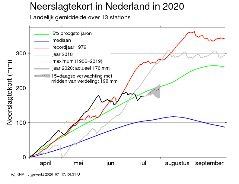 Het neerslagtekort is nu vergelijkbaar met recordjaar 1976. Vanaf komend weekend wordt het licht wisselvallig met elke dag kans op enkele buien. Het neerslagtekort blijft dan waarschijnlijk oplopen, maar niet zo snel als nu. In 1976 was dat wel anders en daarmee lijkt het erop dat dit jaar na deze week niet langer droger of vergelijkbaar is met recordjaar 1976. Wel blijft 2020 voorlopig behoren tot de droogste jaren ooit.