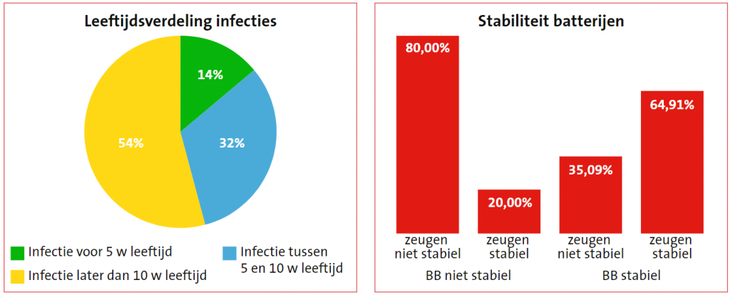 - De mate waarin biggen geïnfecteerd worden in het kraamhok is sterk gecorreleerd met de mate van uitscheiding door de zeug. Meestal is de besmettingskans van de biggen lager naarmate de zeugen ouder zijn.